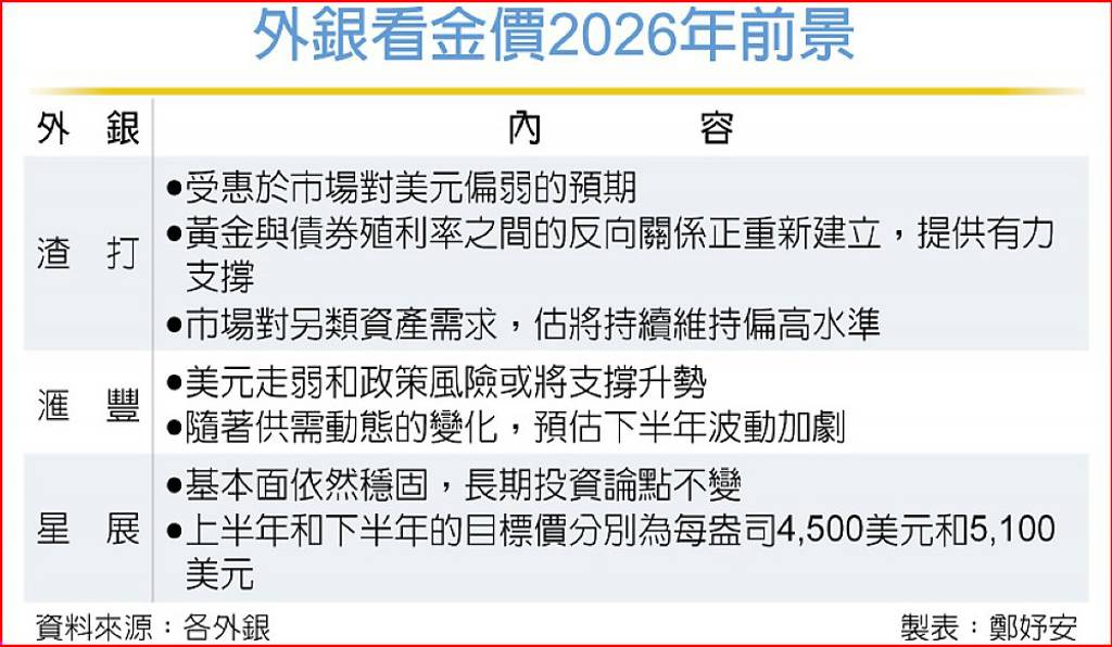 黃金於2025年寫下近半世紀來最亮眼的年度表現,即便年底交投轉趨清淡、價格波動加劇,仍無損其作為核心避險資產的地位。展望2026年,美元走勢、聯準會政策轉向、地緣政治風險,以及央行與投資人對替代資產的配置需求,將持續牽動金價走向。外銀估市場對另類資產的需求,將持續維持偏高水準。