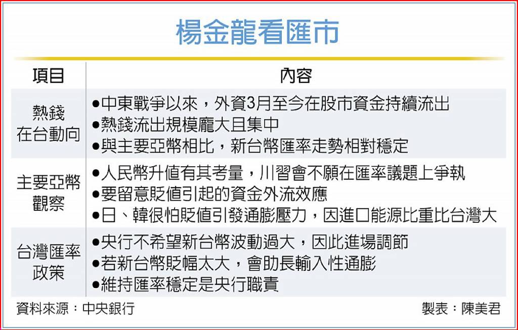 外資已成為影響台北金融市場的主要變數,對在台熱錢最新動向,央行總裁楊金龍19日表示,中東戰爭後,外資持續匯出,規模龐大且集中,導致新台幣趨貶,但相較其他主要亞幣,走勢仍相對穩定。他強調,新台幣若過度弱勢會助長輸入性通膨壓力,因此維持匯率穩定是央行職責。